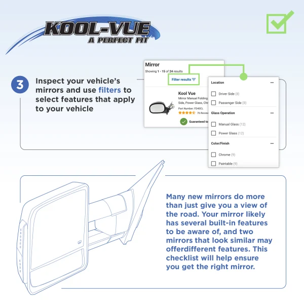 Kool Vue mirrors provide an unobstructed view of the road around you. Each mirror is designed to be a direct replacement for your vehicle’s factory equipment. Kool Vue mirrors are offered with available features such as blind spot detection, auto-dimming, and additional lighting elements (depending on your application) that provide added visibility in various driving conditions. Fit and finish are impeccable, resulting in a product that delivers reliable performance year after year.